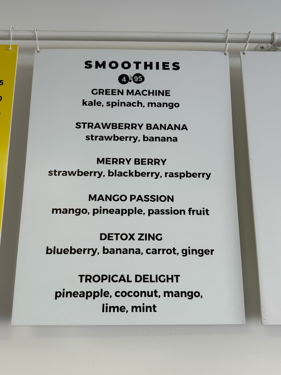 Smoothies are offered in a range of fruit blends like Green Machine, Strawberry Banana, Merry Berry, Mango Passion, Detox Zing, and Tropical Delight, providing cold drink choices for refreshments or light snacks.