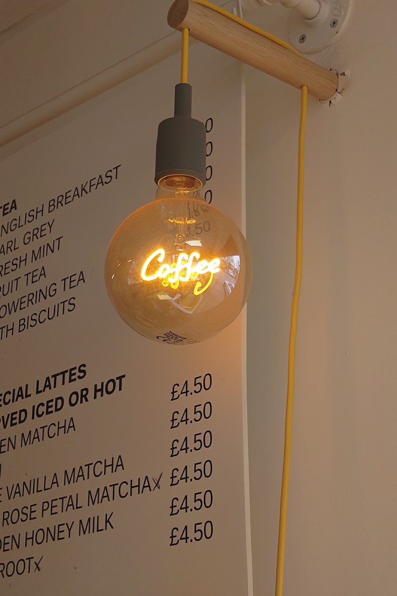 Coffees include classic options such as Flat White, Latte, Cappuccino, Mocha, Americano, Cortado, Macchiato, and Espresso, with prices ranging from £2.30 to £3.75. Special lattes are also available, including Chai Latte, Green Matcha, Blue Matcha, and Turmeric Latte, each priced at £4.50.